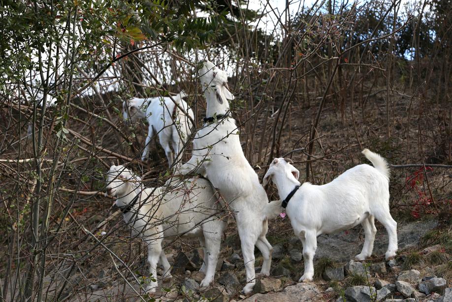 A 4-foot-high electric fence, powered by a solar battery, will keep the goats contained and protected from wild animals and dogs. Residents are welcome to visit the area and watch the goats at work but shouldn’t try to pet them as they may have poison ivy oils on their hair.