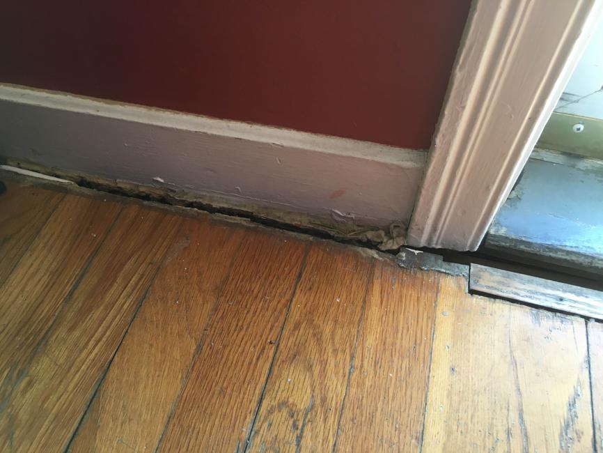 The gap between the floor and a wall may be the result of a heavy door slamming shut.